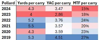 - 2024: 3.1 yards after contact per carry, 15.6 missed tackles forced per carry