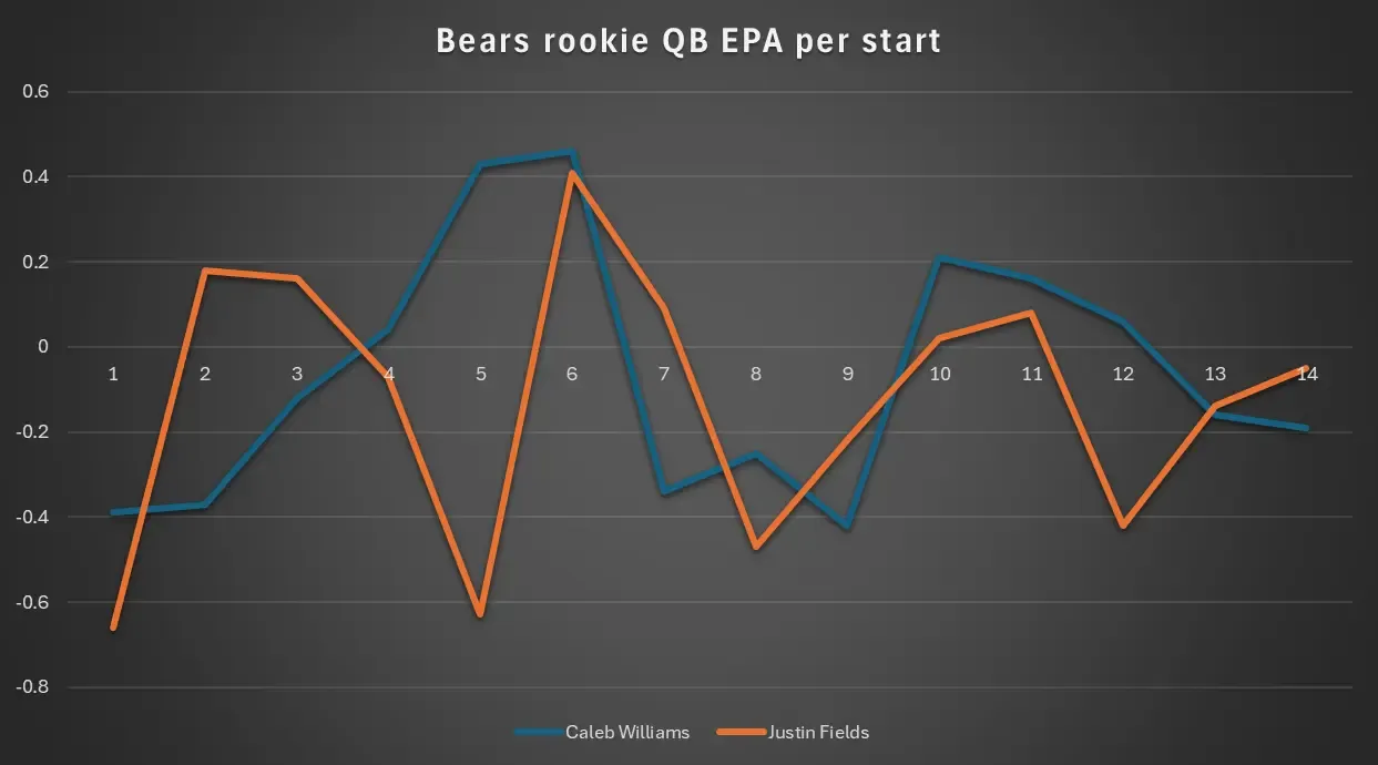 That said: Williams' progression from start to start hasn't exactly led to much of a separation from Justin Fields when looking at how he performed in his first 14 career starts.