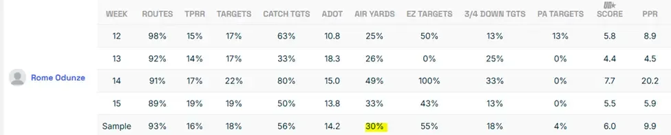 First, Ridley’s target share has been switching from WR1 numbers to WR3 levels over the last three weeks. The main culprit? Chig Okonkwo. Tennessee’s TE1 has had 6, 4, and 10 attempts thrown his way since Week 13. Nick Westbrook-Ikhine has also snagged some looks here and there, dropping Ridley from a 25.0% target rate after DeAndre Hopkins’s departure to 22.0%. It’s a slight drop, but with a backup QB, he’ll need as many cracks at turning air yards into actual yards as much as possible. And it’s not like the Colts’ defense will let him do it easily.