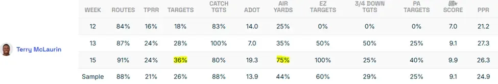 Noah Brown was out before kickoff. Zach Ertz went down in the middle of the game with a concussion. Subsequently, McLaurin hit a season-high 36.0% target share with a whopping 75.0% of the team’s air yards. We think of him as the Commanders’ best option, and his usage hammers the point home. However, he’ll need the volume to maintain a high-end WR2 rank for Week 16.