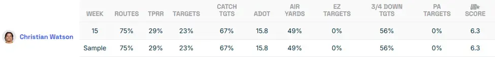 Watson plays both sides of the field but tends to align on the left side of the offense (44.0% of his snaps at left WR). His alignment indicates he’ll likely draw New Orleans CB Kool-Aid McKinstry. In just three games since the Saints’ bye, McKinstry has allowed the 10th-highest passer rating when targeted of any corner with more than 100 coverage snaps. Terry McLaurin worked him for a score in tight coverage on Sunday. While the Packers have been more focused on their running game as of late, a deep shot (resulting in a TD) to Watson makes him worth FLEX consideration in Week 16.