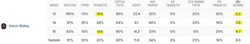 The last wideout to face Indianapolis and score more than 20.0 PPR points was Justin Jefferson back in Week 9. Since then, the list of primary options who’ve had floor games has continued to grow. Rudolph was able to operate the offense in relief of Will Levis last week, but without a concerted effort to get Ridley the ball, he’s more of a WR3 for Week 16.