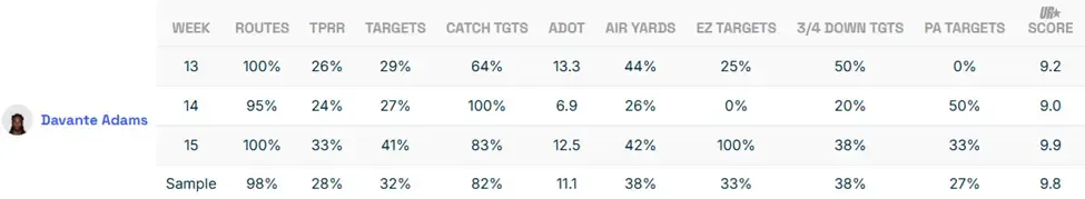 Since their Week 12 bye, Adams has taken over as the WR1. He’s had the same or more targets than Garrett Wilson in three straight games. Also, look at the catchable target rate (“Catch Tgts” column). Because Adams runs from the slot (50.9% interior snap rate) more than Wilson, the vet has greater access to layup attempts from Rodgers to move the chains. It’s part of why 17 of his 35 targets have gone for first downs. So Adams not only has the workload but also the easier share of the looks to generate fantasy points. He also has a matchup he can exploit.
