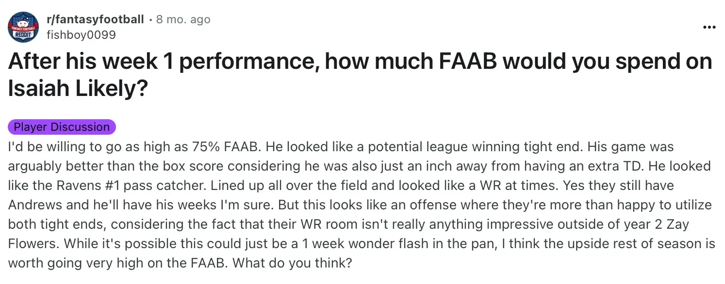 Last season, fantasy managers ran to the waiver wire to drop all (or in Fishboy's case, 75%) of their FAAB on Isaiah Likely after his TE1 performance against KC in Week 1.