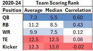This is unique relative to top players at other positions. The top fantasy kickers (top six) have actually been negatively correlated with their scoring offense!