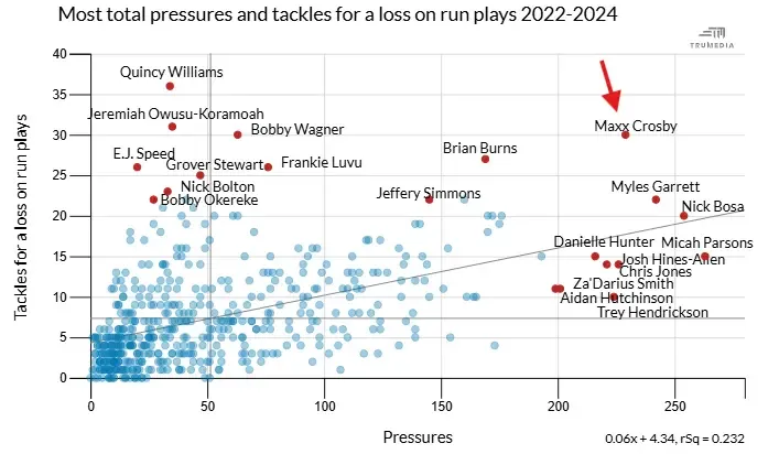 Crosby ranks fourth in total pressures and seventh in sacks over the past three seasons, but it's perhaps Crosby's similar ability to create havoc against the run that separates him from some of the other best EDGE defenders in the league.
