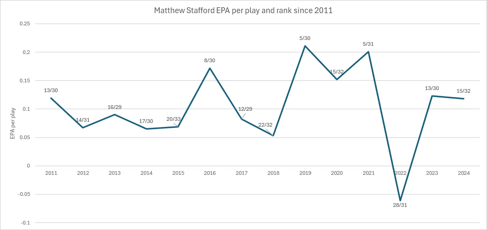 Unfortunately the fantasy numbers have indeed been below average. 2021 (QB11 in fantasy points per game) was cool and all, but we've seen Stafford fail to crack the position's top-15 performers in 2022 (QB29), 2023 (QB16), and 2024 (QB27) alike. Of course, a big part of this is reality that Stafford is a complete zero on the ground at this point in his career; he needs high-end production through the air to even come close to providing solid fantasy production—something that seems a bit unlikely inside the league's reigning seventh-most run-heavy offense in terms of dropback rate over expected.