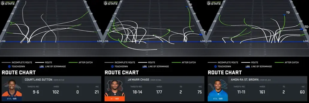 I chose Courtland Sutton, Ja’Marr Chase, and Amon-Ra St. Brown here purposefully. All three are WR1s for their respective squads. However, their separate approaches to the role couldn’t be more stark.