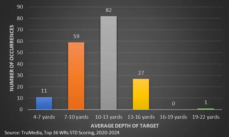 The jabs, stutter steps, or outright speed to separate change with each play. But they all (should) cause a reaction when rewatching. However, mathematically, each route is just a number. Davante Adams picked up 18 air yards on his clip. Stefon Diggs just needed seven. Ultimately, the distribution of depths averages out to a single number. And history gives us an indication of what to look for in top WRs.