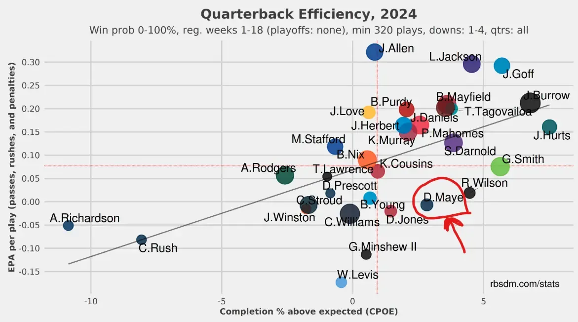 Of course, the real difference-maker in fantasy land among this group is the rushing prowess at hand, something that Maye proved to be awfully good at as a rookie and during his time at North Carolina. Overall, nobody averaged more yards per carry than Maye (7.8, min. 50 carries) last season, as the rookie racked up more rushing yards on scrambles than anyone other than Daniels. That's right: Maye was technically more lethal than Lamar f*cking Jackson when scrambling!