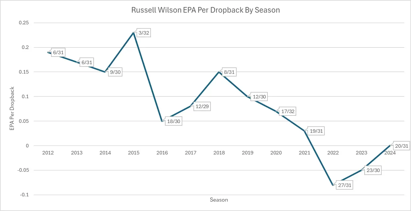 However, the one thing that hasn't gone out of style just yet: Wilson's patented moon ball! Overall, nobody had a higher passer rating (126.3) or averaged more yards per attempt (16.1) on passes thrown at least 20 yards downfield in 2024 (including playoffs).