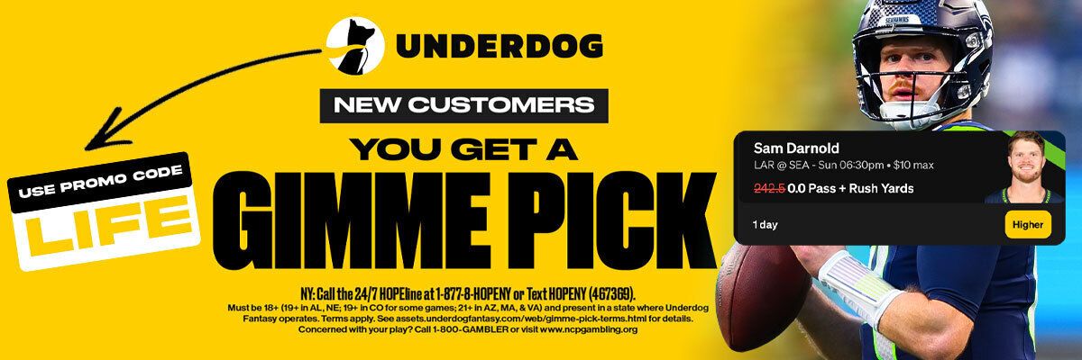 Sign up and claim your free pick today! Pick higher or lower on your favorite players and cash in on Underdog today! New customers will receive a FREE Sam Darnold pick when you sign up. Sign up for Underdog using our promo code: LIFE and you can earn up to $1,000 Bonus Cash on your first deposit!