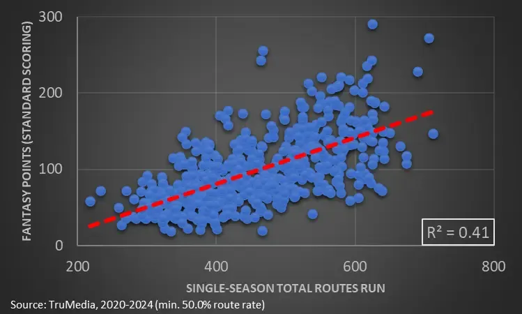 Even if I had been around one of the weekends when something wild happened around campus, I wouldn’t have been in the middle of the chaos. One, I was on an academic scholarship. Two, I weighed about a buck-sixty. I’d be safely minding my business (read: people-watching) in the background. All that to say, just being there doesn’t equate to action. Hence, we should expect a weaker connection between routes and fantasy points.