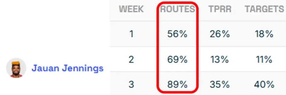 I’m just going to tell you right now that following routes won’t guarantee you a receiver who will post the second-most points of any WR throughout the entire season. But let’s return to our reframing of what routes are. They measure involvement. Increased participation signals deference by the play-caller to keep a specific pass-catcher on the field. And looking at Jauan Jennings' routes in the weeks before his Week 3 outburst, the workload bump doesn’t seem like an accident.