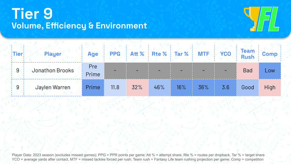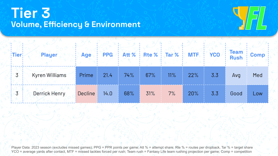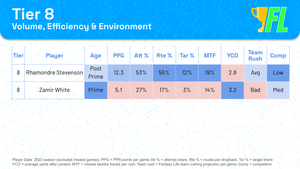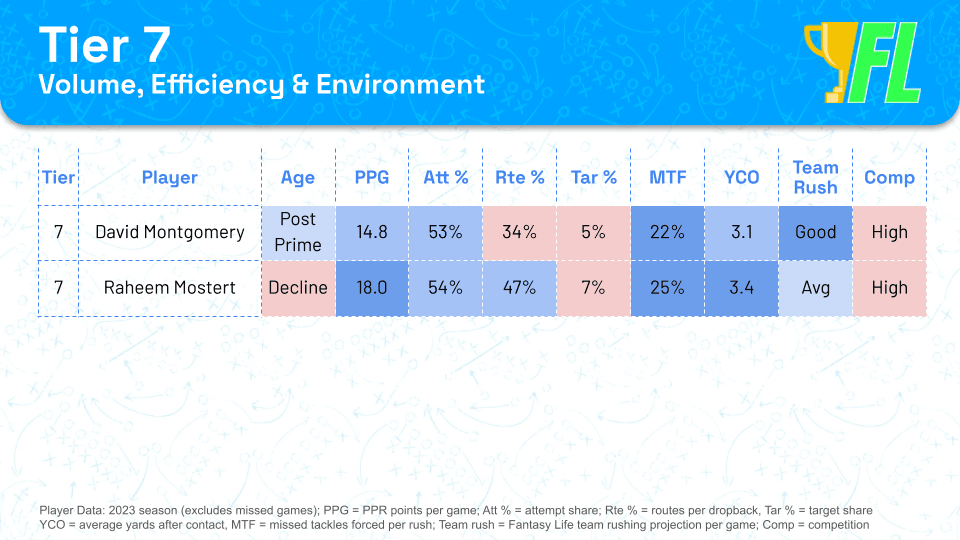 These two players don't project as well as some of their older counterparts below, but their age keeps them ahead in my rankings. Once the NFL season kicks off, all sorts of weird things will happen, and I want to prioritize talented young backs over aging options. However, you can use the tiers interchangeably based on your preference.