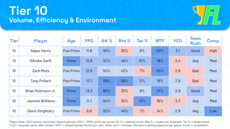 Team environment is a massive factor for fantasy production at the RB position. Getting 60% of the rushing volume on a high-scoring offense committed to running the ball is much different than 60% on a low-scoring offense forced to pass due to trailing game scripts.