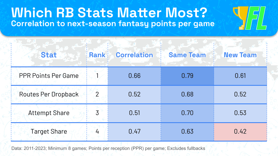 Like other positions, historical fantasy points per game are the gold standard for predicting future fantasy production. However, unlike WRs and TEs, just getting on the field is a massive win for RBs. Targets don't always follow routes for receivers, but rushing attempts go hand-in-hand with snaps at the RB position, and previous-season volume is the strongest predictor of future volume.