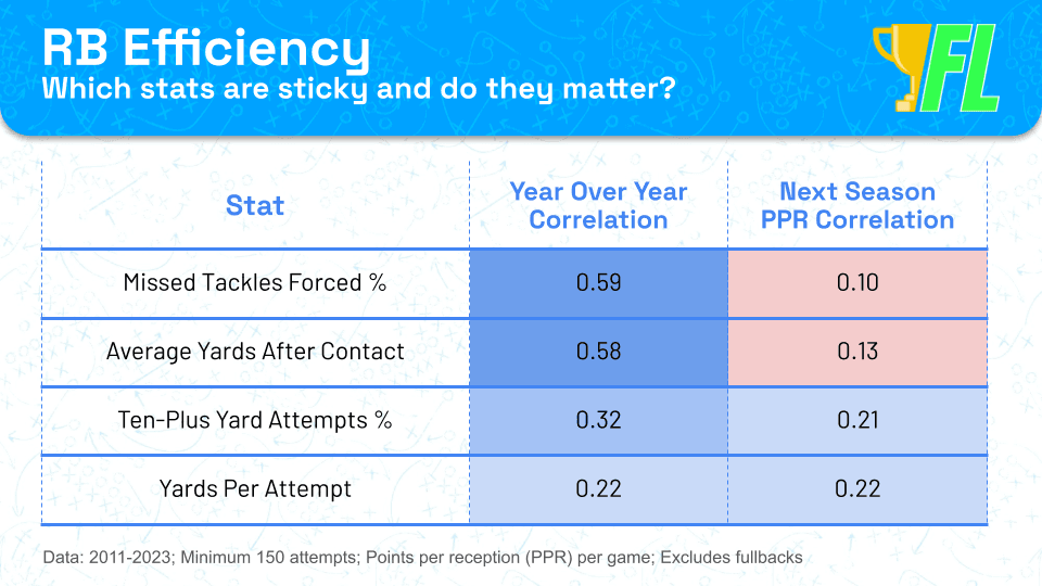 Efficiency stats are great tiebreakers for backs with similar volume expectations. However, historical data tells us a couple of essential things to remember.