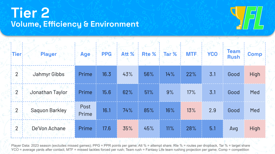 This tier has choose your poison vibes. You can go with guys with safer projectable volume, like Taylor and Barkley, or swing for upside with Gibbs and Achane, who have more competition for touches.