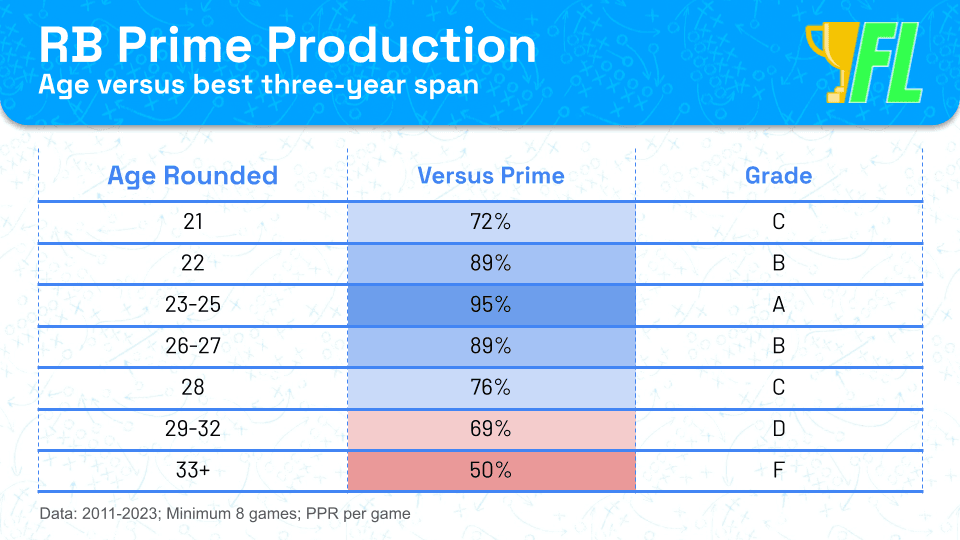 - Prime: Ages 23 to 25. The best years for RB production.