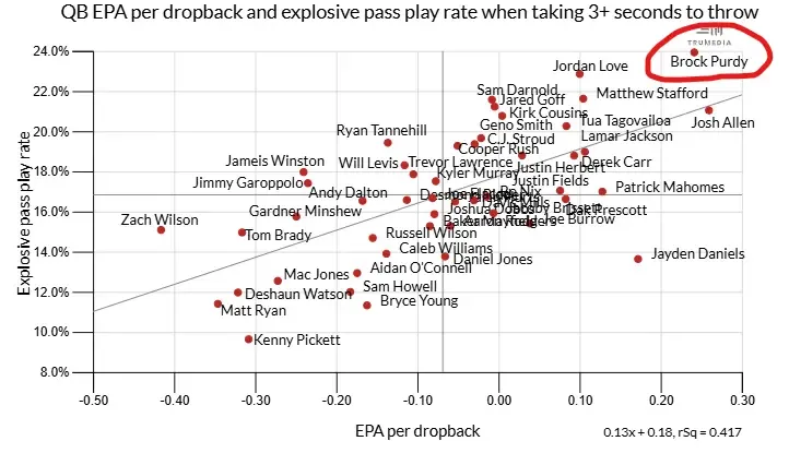 Consider: EPA per dropback and explosive pass-play rate over the past three seasons when the throw has come three seconds or later after the snap AKA the sort of situations where the first and second read probably weren't available so the QB had to hold the ball and improvise.