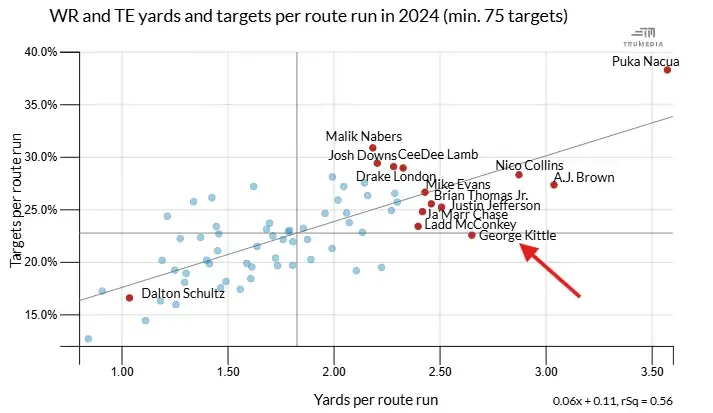 Overall, Kittle became just the fifth player in NFL history to gain over 1,100 yards on under 100 targets, joining Stefon Diggs, DeSean Jackson, Jordy Nelson, and Mike Wallace. Pretty good company, and again to make this point clear: HE'S A TIGHT END!