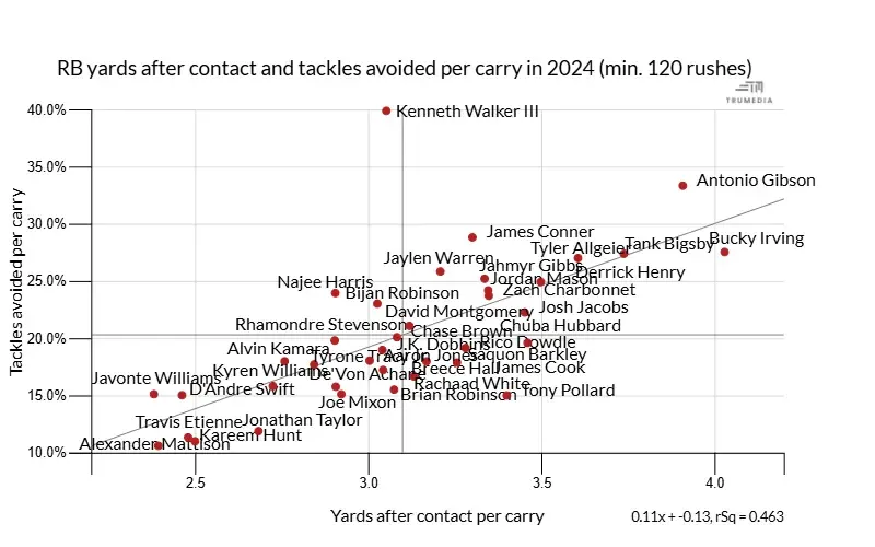 The tackle-breaking ability is quantifiably absurd. PFF charted Walker with a whopping 39.9% tackles avoided rate on rushes—that's the highest mark since at least 2020 among RBs with at least 150 carries in a season!