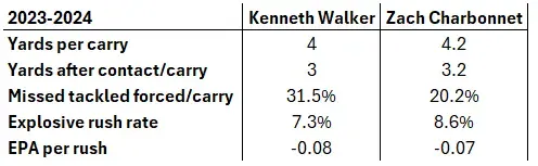 Here's the thing: Breaking tackles is really the only thing that Walker has consistently done better than his backfield mate Zach Charbonnet over the past two seasons. Obviously they are different players being asked to do different things against defenses likely treating them differently, but man, I'm guessing someone who hasn't watched football would pretty quickly choose Charbonnet as the superior RB just based on these numbers.