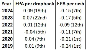It'd make a lot of sense if the awesome Year 1 and late-season surge leads to a more featured role in 2025, although the overall history of Day 3 or UDFA RBs who boomed as rookies is actually quite troubling.