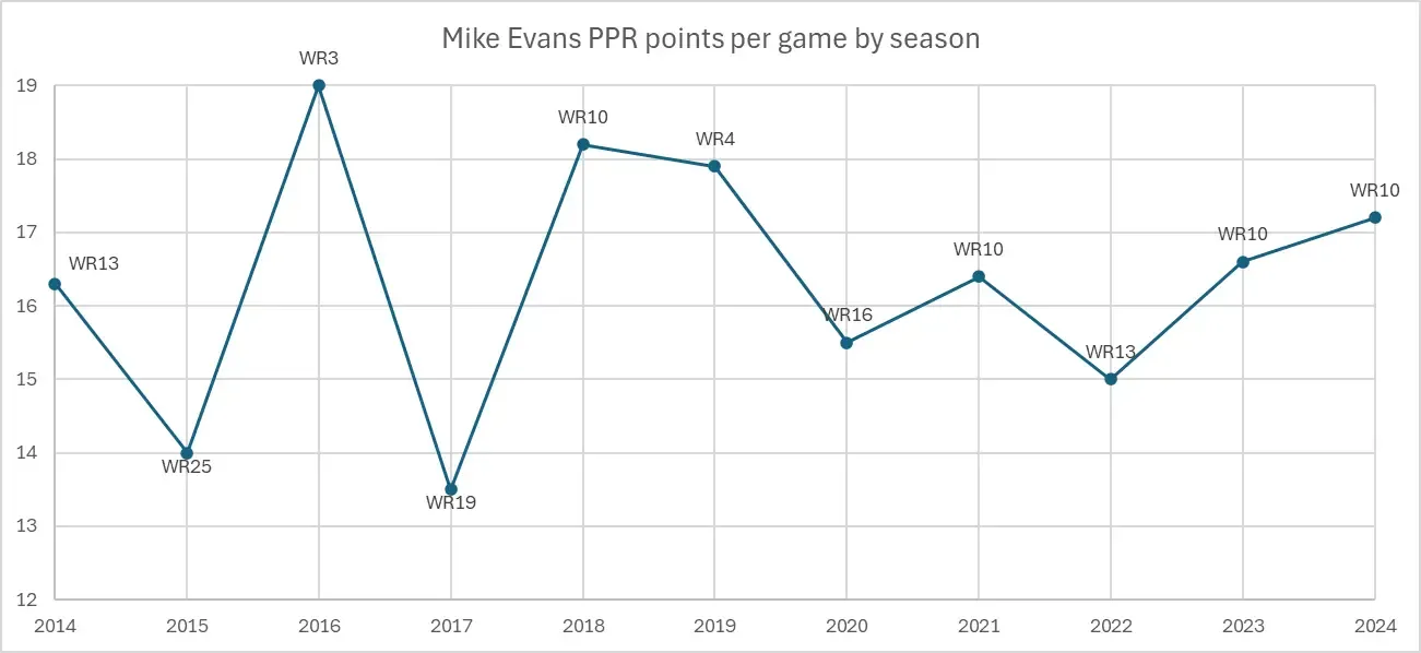 Evans' WR20 ADP feels like (another) bet that Father Time is coming for the soon-to-be 32-year-old veteran. While the history of 30-plus-year-old WRs balling in fantasy land isn't great, it's also not exactly non-existent. Ultimately, I'm fine mixing in the longtime stud in the same tier as fellow No. 1 vets like Terry McLaurin and DJ Moore, but the target competition and age are concerning enough to not exactly make Evans someone I'm consistently going out of my way to draft.