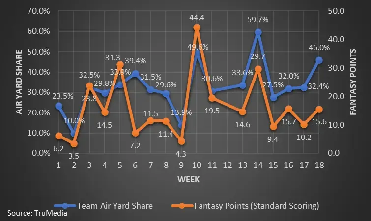 Winston’s gunslinger mentality is both a gift and a curse to fantasy managers and defenses alike. His near two-yard gap in air yards per attempt brought WRs like Cedric Tillman into the fantasy limelight. At the same time, opposing coverage units became a worthy pickup. Regardless, it all came back to Winston’s ability to rack up air yards. And the fantasy points followed soon after. Luckily, the connection between air yards and scoring isn’t limited to one QB archetype.