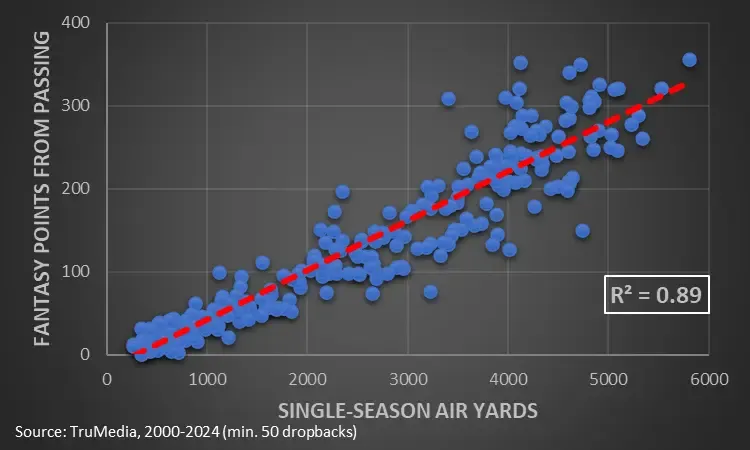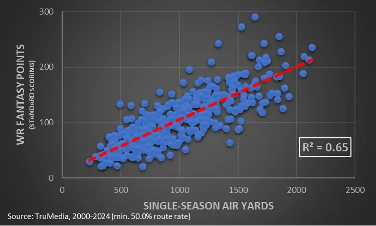 Remember, air yards are how far the ball moves from the QB’s release to the receiver’s reception. But we all know players can make things happen afterward. Then, a combination of yards after the catch and air yards should have a greater tie. Coincidentally, if I add each player’s YAC to their air yards (as a quick check), the R2 jumps to 0.81. Plus, the link between air yards and fantasy scoring isn't limited to just one year.