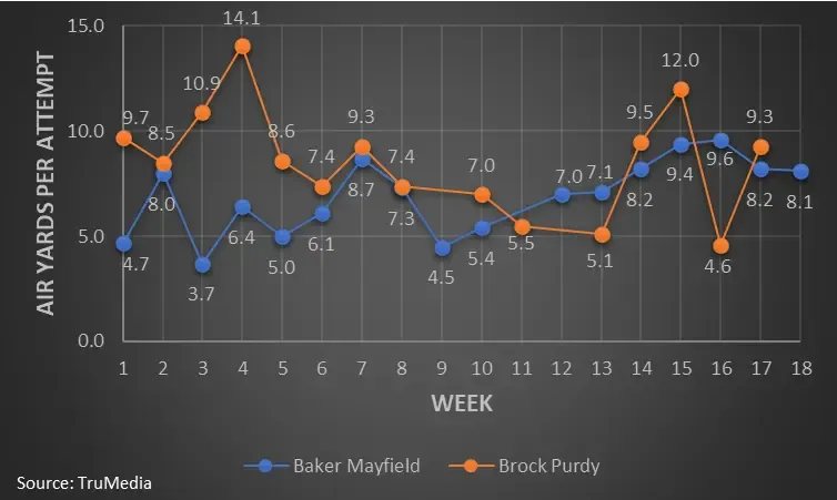It should be no surprise that throwing farther invites volatility. Purdy was doing his best Jameis Winston impression at times, which impacted our expectations of Deebo Samuel. At the same time, Mayfield was letting Cade Otton and Bucky Irving do the heavy lifting. Accordingly, Purdy’s air yards per attempt settled as Christian McCaffrey returned (and spiked as soon as he left). Regardless, the outcome of weighing air yards remains the same.