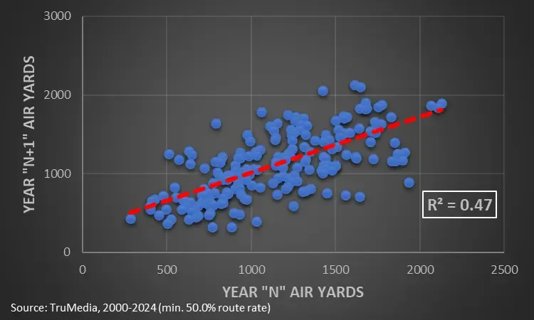 Two quick notes from the above chart. First, an "n vs n+1" graph points to year-over-year stability. For instance, CeeDee Lamb's air yards went from 1,565 in 2022 to 1,722 the following year. Intuitively, this makes sense. If we agree that air yards are a measure of opportunity, then past performance should inform future outcomes. Second, air yards (like any stat) aren't the end-all, be-all, which is why the R2 drops to 0.47. Situations change, but talent typically wins out, giving us a way to predict the receivers we should roster even during the season.