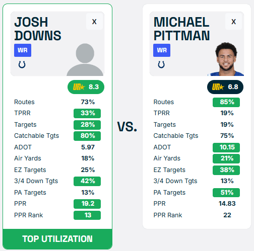 - Pittman: 14.8 points per game, 6.8 Utilization Score, 19% target share