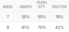 On top of that, we saw a big step forward in Chubb’s usage from Week 7 to Week 8: