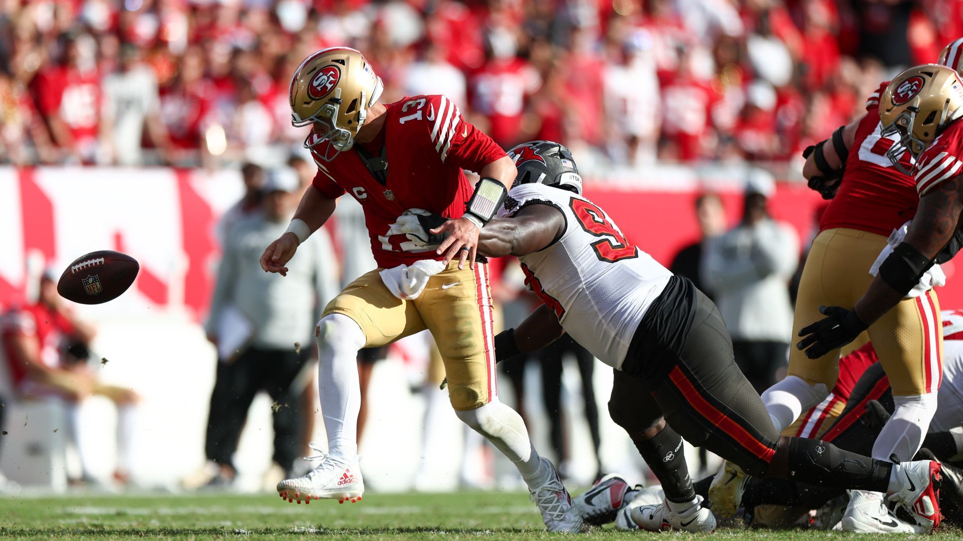Nov 10, 2024; Tampa, Florida, USA; Tampa Bay Buccaneers defensive tackle Calijah Kancey (94) knocks the ball loose from San Francisco 49ers quarterback Brock Purdy (13) in the fourth quarter at Raymond James Stadium. Mandatory Credit: Nathan Ray Seebeck-Imagn Images