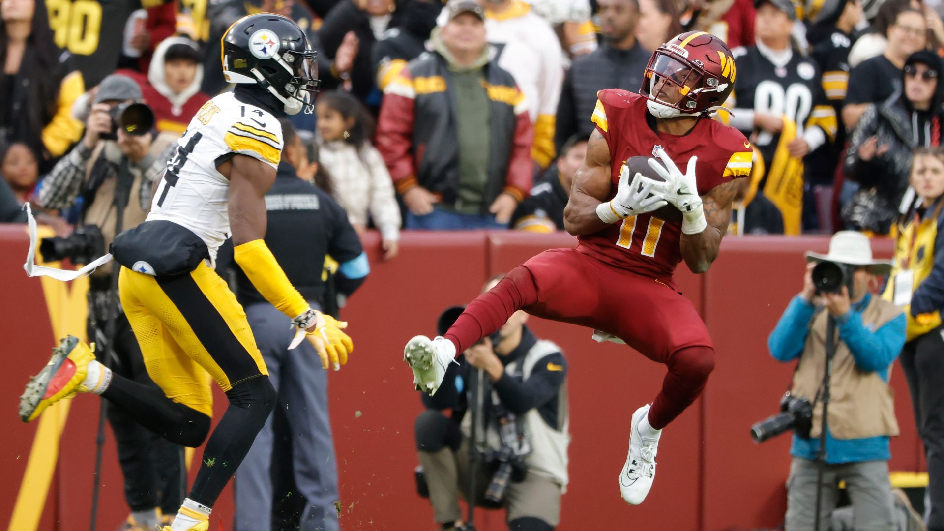 Nov 10, 2024; Landover, Maryland, USA; Washington Commanders safety Jeremy Chinn (11) intercepts a pass intended for Pittsburgh Steelers wide receiver George Pickens (14) during the second half at Northwest Stadium. Mandatory Credit: Amber Searls-Imagn Images
