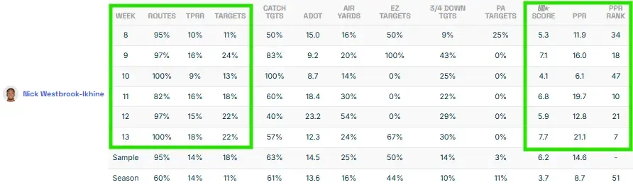 If you’re light at wide receiver, one player who will be highly sought after if he’s still on waivers is Nick Westbrook-Ikhine. He has eight touchdowns in his last eight games and boasts a 6.2 utilization score and 14.6 FPPG over his last six. The Titans are projected as having the 4th-easiest WR schedule through Week 17, and with Westbrook-Ikhine commanding a 15% TPPR rate and 61.25 air yards since Week 6, he could be a league winner.