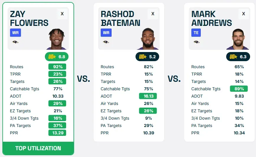 His target share (15%) leaves a lot to be desired, especially on a team that runs the ball so frequently, but his aDOT (16.1) and air yards share (26%) highlight his game-breaking potential. As we mentioned with Hill, the Ravens can beat you in a lot of ways. If it turns into a Bateman game, that could be the difference your team needs to make it to the championship weekend.