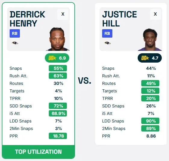 Through Week 15, Hill is crushing Henry in routes, targets, TPRR, LDD snaps, and 2-minute snaps. We know the Ravens' offense can pile on the points in a hurry and can beat teams in a variety of different ways. Hill has the experience and data to force himself into your lineup if you need a potential splash play this weekend.