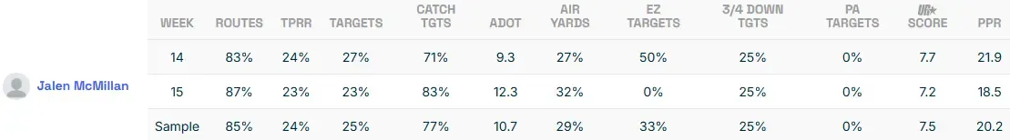 Sticking with the same NFC matchup, rookie wideout Jalen McMillan has stepped up in a big way over the last two weeks, tallying nine receptions for 134 yards and three scores. While we don't want to get caught chasing points, it's worth noting that his underlying metrics are backing up his spike in production.