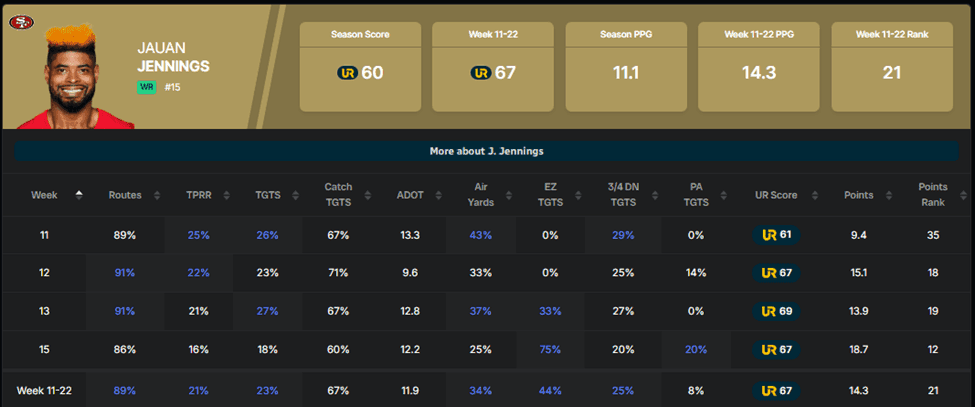 To be honest, I wouldn’t necessarily recommend a contextualized usage profile like Jauan Jennings’ after looking at his last month of action (pinch to zoom in below!).