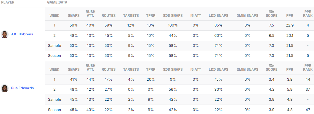 Dobbins has made this column as a sicko start and upgrade over the last two weeks, but with a matchup against the Steelers on tap and the fourth-lowest team total (17 points), it is time for a brake tap in Week 3. Dobbins has been electric but is still in a timeshare with Gus Edwards.