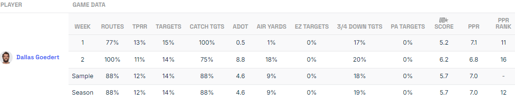 Goedert only has a 14% target share, but his three-year average is 17%, and with A.J. Brown likely sidelined again, there is upside for a spike game. The veteran TE played every passing play against the Falcons in Week 2 and now boasts a sky-high 88% route participation.