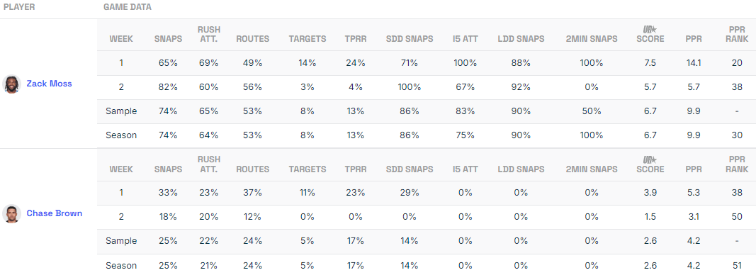 Moss has reached a 65% or higher snap rate in each of his first two games and now has a 6.7 Utilization Score. Historically, backs in that range have averaged 12.2 points, making Moss a prime regression candidate in Week 3.