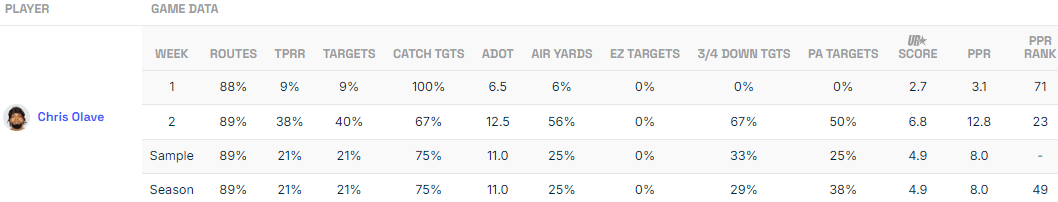 Olave demonstrated borderline WR1 traits over his first two seasons and posted a 40% target share in Week 2. The third-year WR was tackled at the one-yard line against Dallas, keeping his fantasy output modest at 12.8.