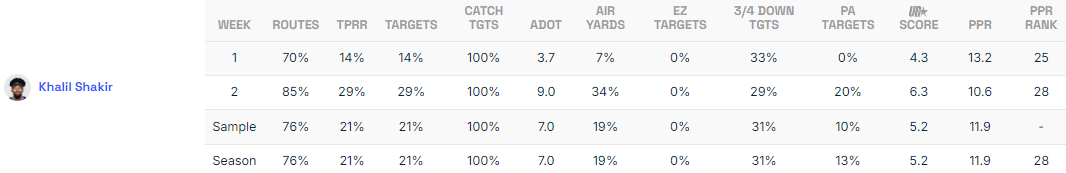 Shakir is currently the WR30, averaging 11.9 points per game, but there is room for much more. In Week 1, Shakir was shackled with a pedestrian 70% route participation. He played a more prominent role in Week 2 at 85% and was the best WR on the field for the Bills, with a mouth-watering 29% target share. However, a blowout win over the Dolphins allowed the Bills to coast in the second half, keeping Shakir's fantasy points (10.6) in check despite an improved Utilization Score at 6.3.