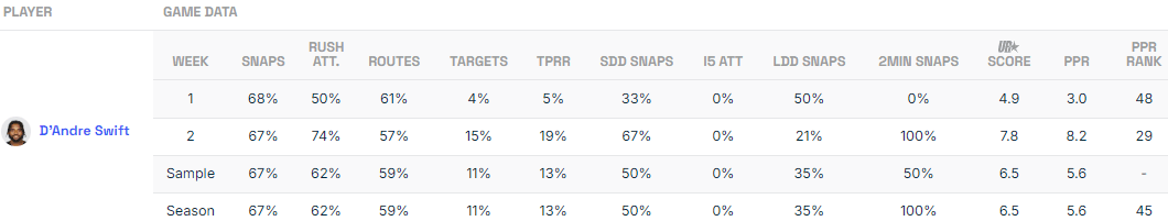 Placing Swift into your starting lineup while averaging 5.6 points per game feels pretty gross. However, he posted 68% and 67% snap shares over the first two games, and his 6.5 Utilization Score is in line with RB2 to RB3 production.