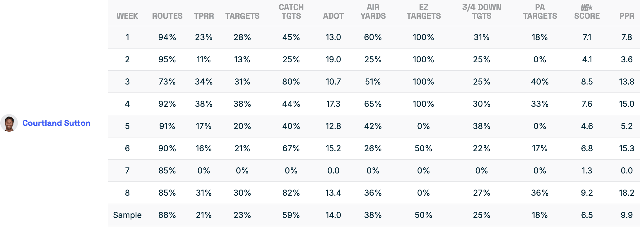 If you want, you can chalk up the success Sutton had last week to his advantageous matchup against the Panthers, and that's fair. Maybe he wouldn't have gotten 11 targets against another opponent.